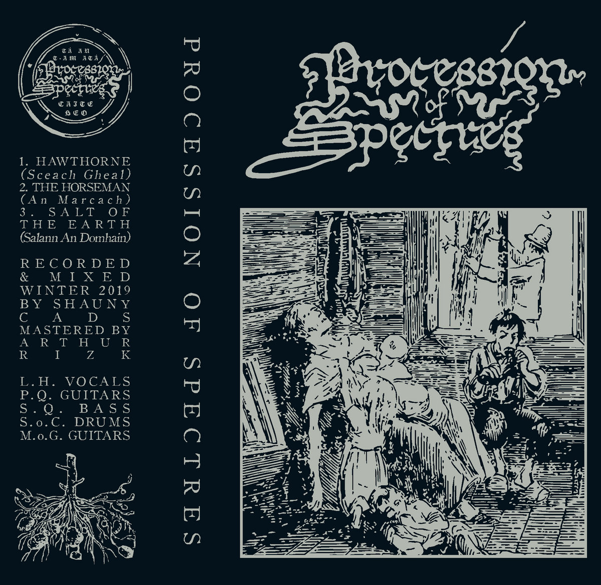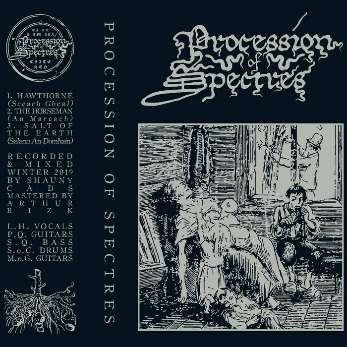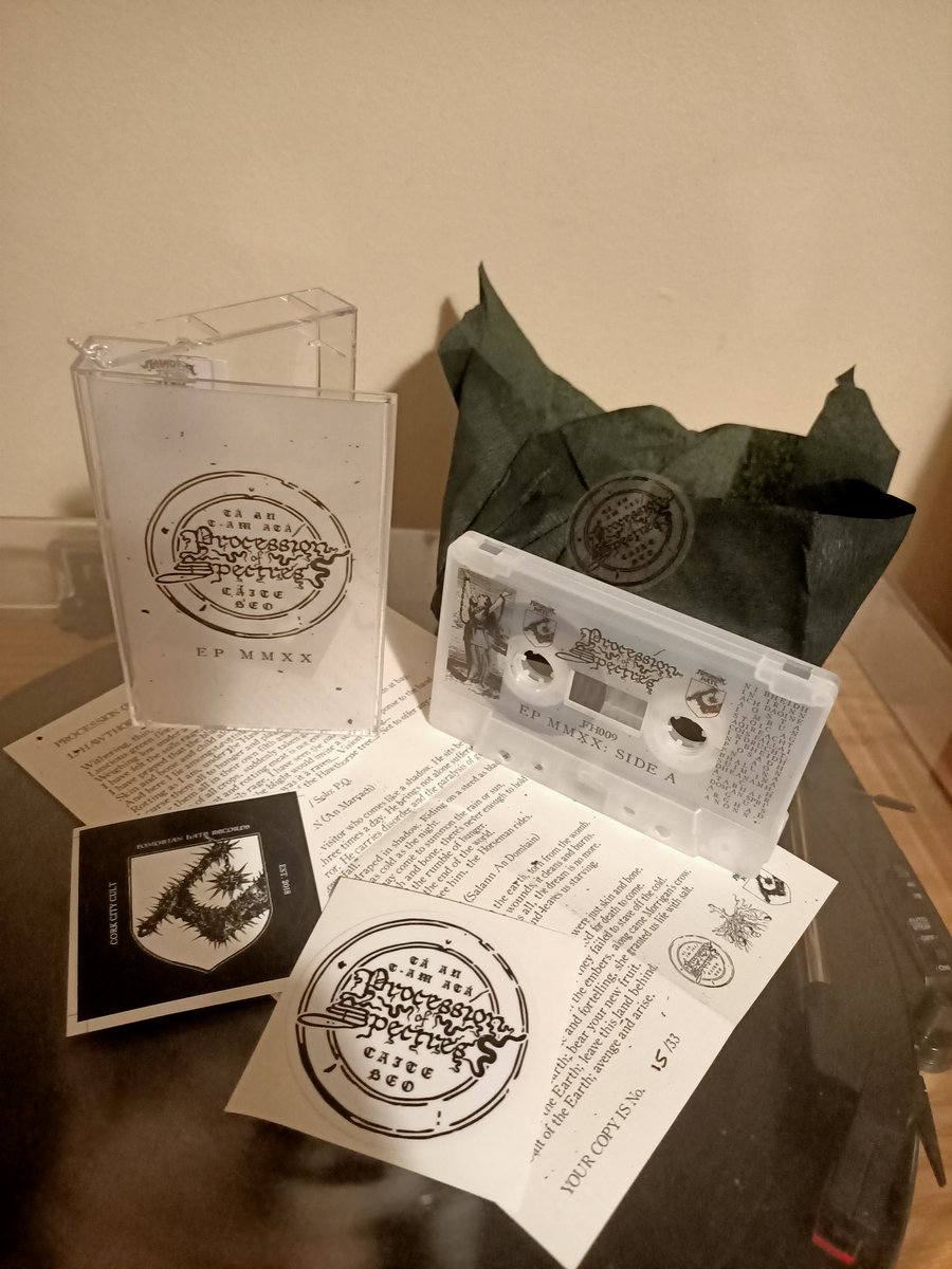 Cassette edition limited to 33 copies. Printed parchment label with folded hand numbered lyrics sheet. Comes with stickers and wrapped in black crepe paper.